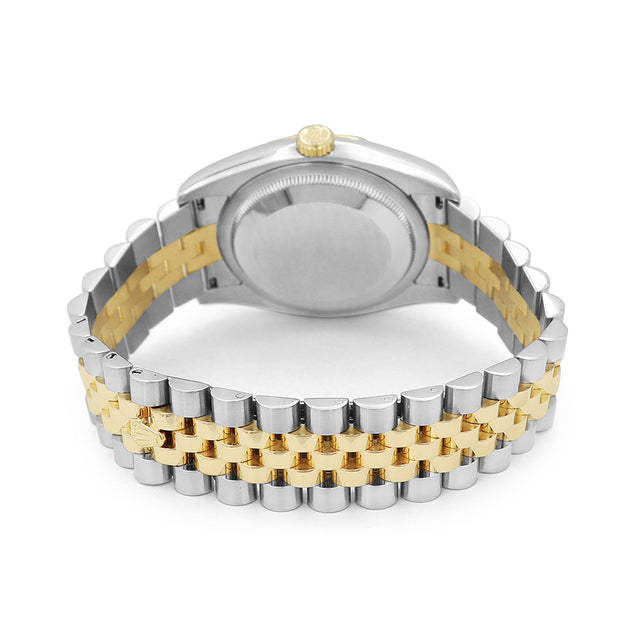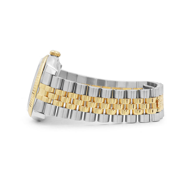 36mm Rolex 18k Gold & Stainless Steel Oyster Perpetual Datejust Watch. Silver 10r Diamond Dial. 18k Yellow Gold Fluted Bezel. 18k Gold & Stainless Steel Jubilee Band. Style 116233.